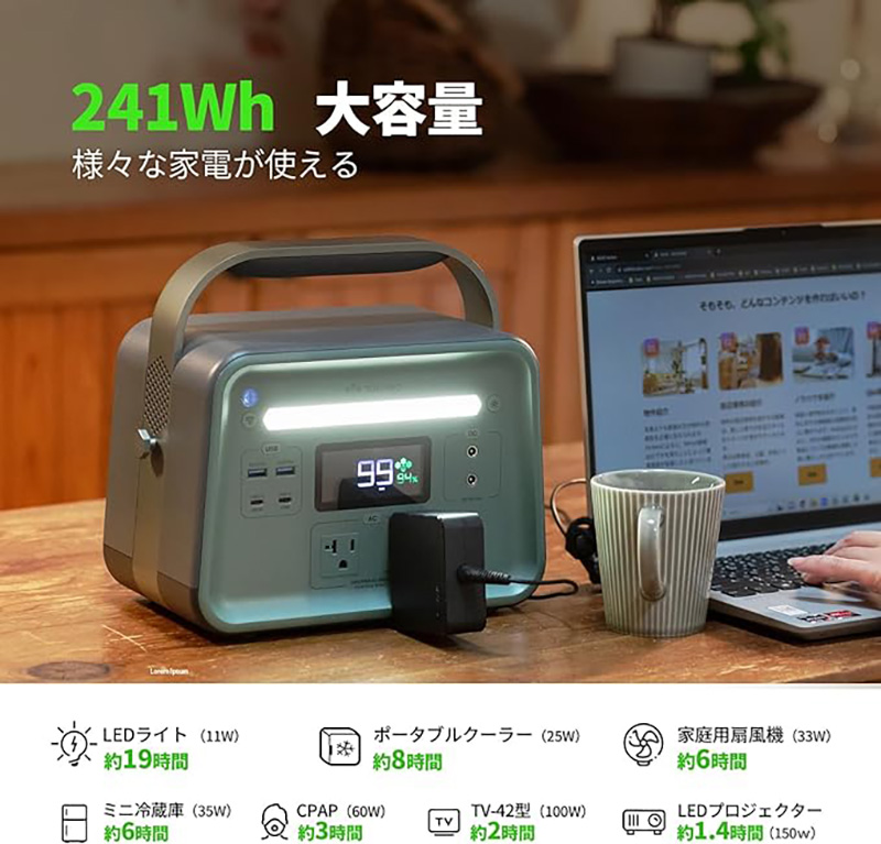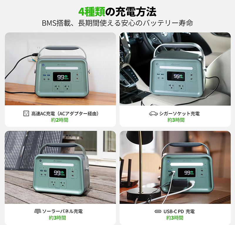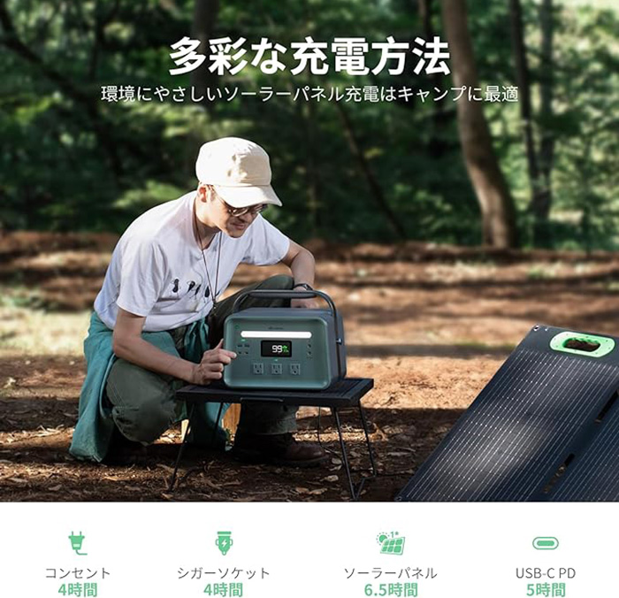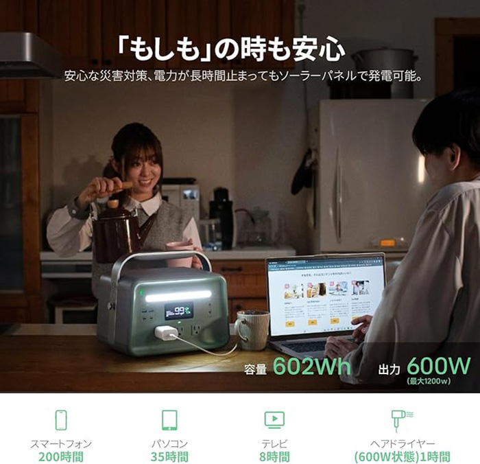 ソーラーパネルでの充電にも対応し、災害時も安心。